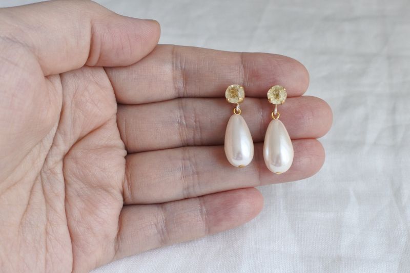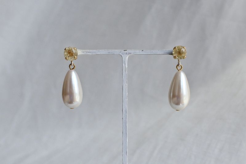 時を経て少しくすみを得たビジューに、しずく型のルーサイトパールを合わせたピアス。
