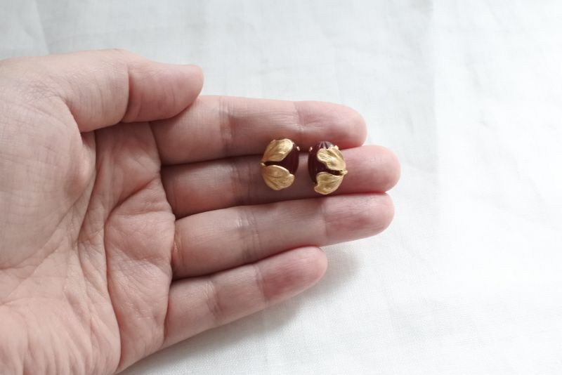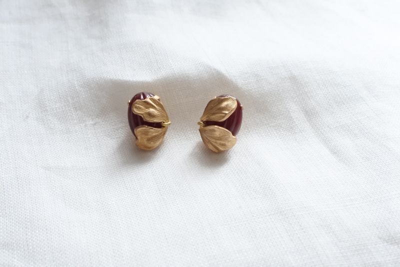 ドイツのヴィンテージカボションを真鍮のリーフモチーフで包んだピアスです。