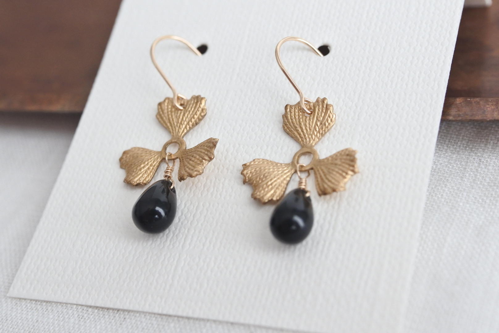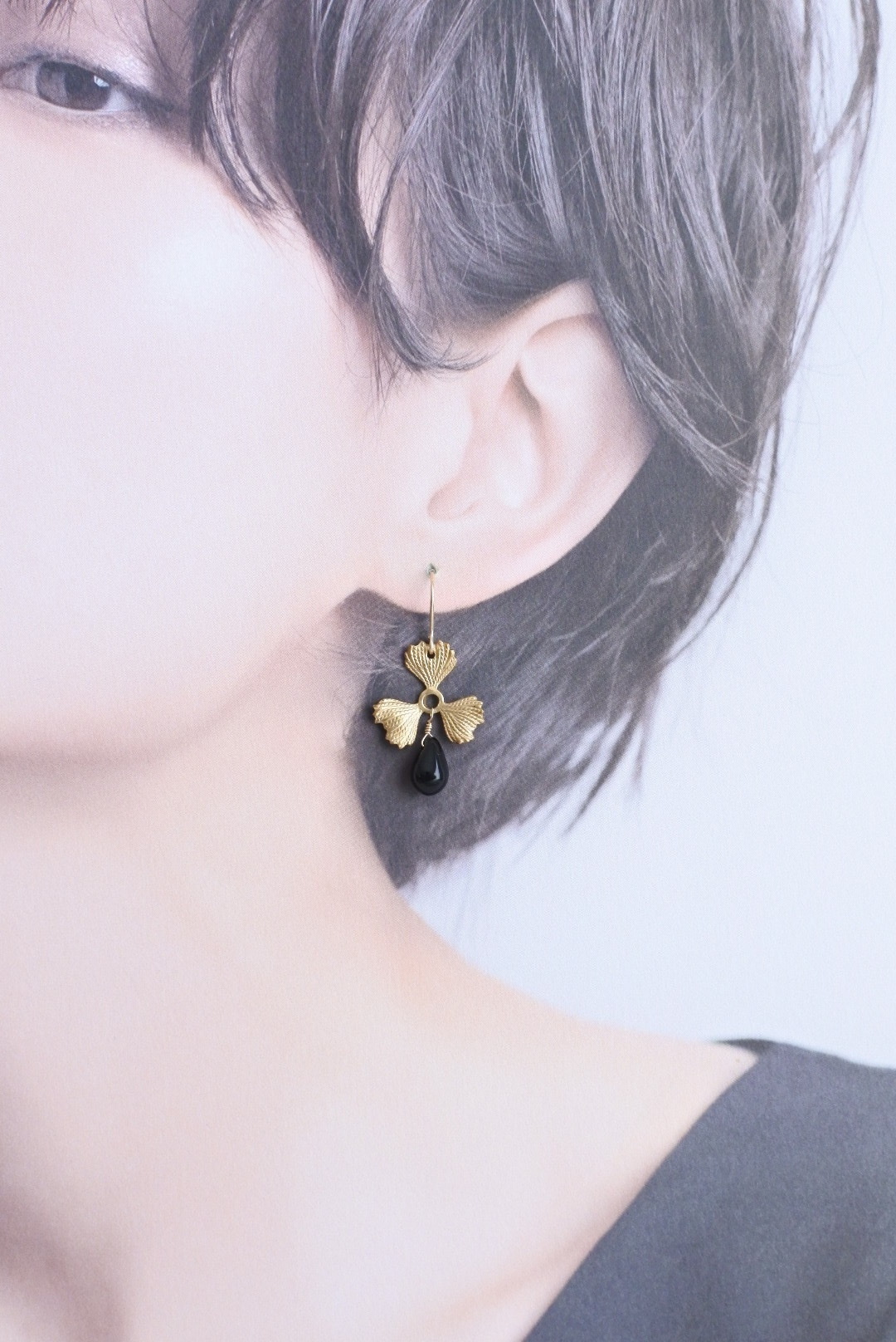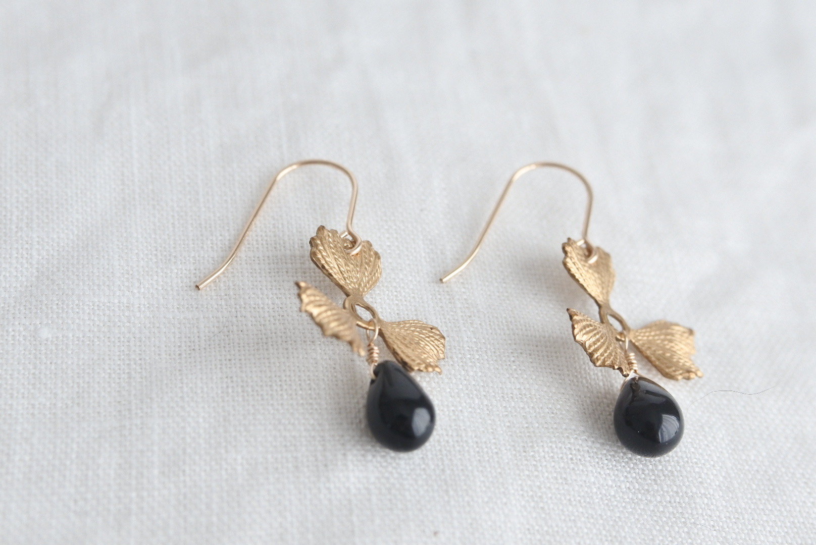 真鍮の無垢な質感と、ドロップ型のチェコビーズを組み合わせた、かわい過ぎないボタニカルデザインです。 真鍮特有の鈍い輝きは、肌馴染みがよく、使い込むほどにアンティークのように変化していく表情を楽しめます。