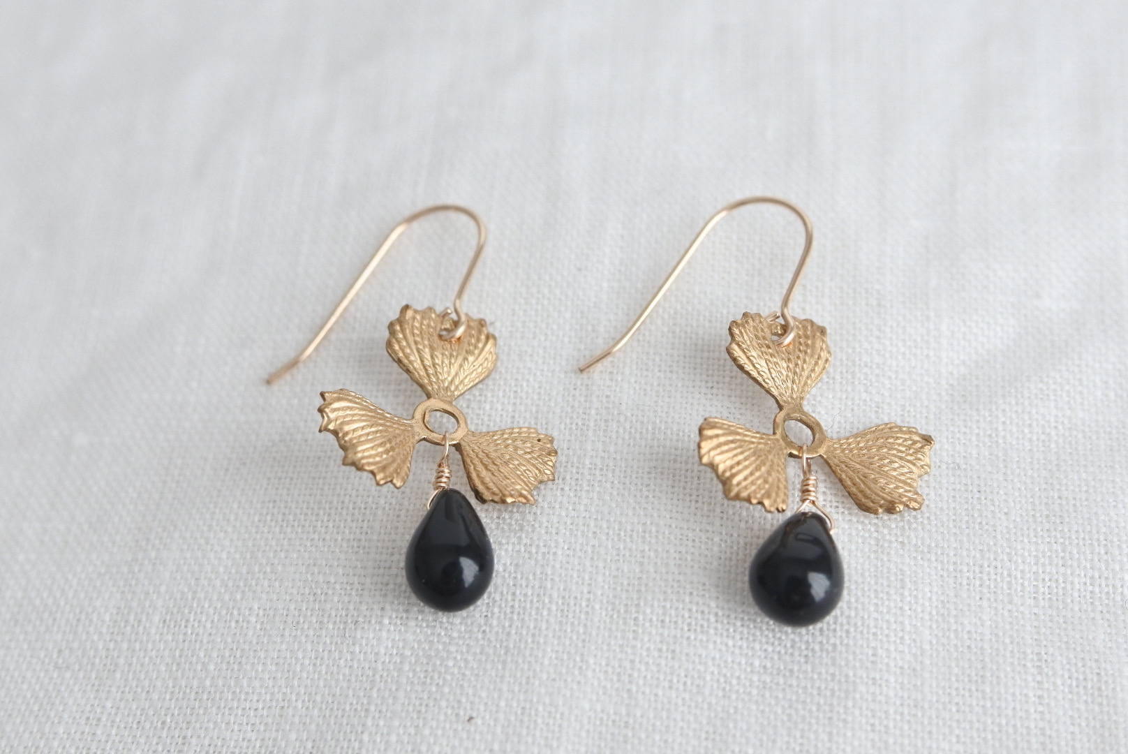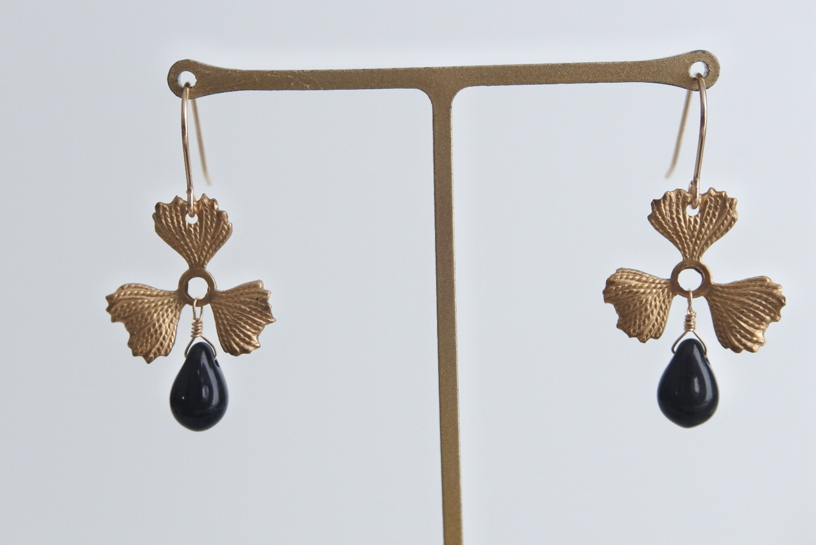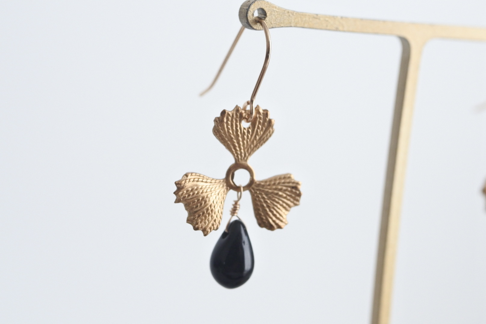 真鍮の無垢な質感と、ドロップ型のチェコビーズを組み合わせた、かわい過ぎないボタニカルデザインです。 真鍮特有の鈍い輝きは、肌馴染みがよく、使い込むほどにアンティークのように変化していく表情を楽しめます。
