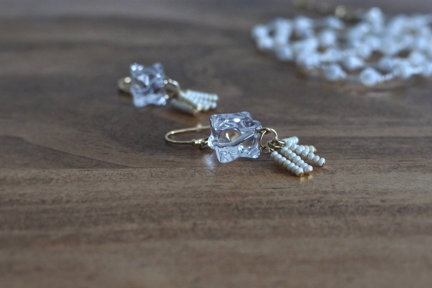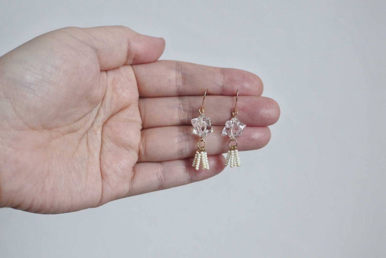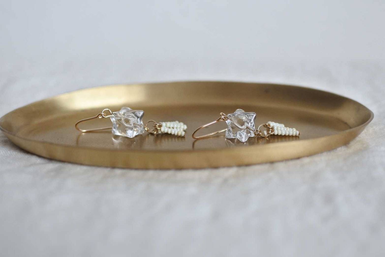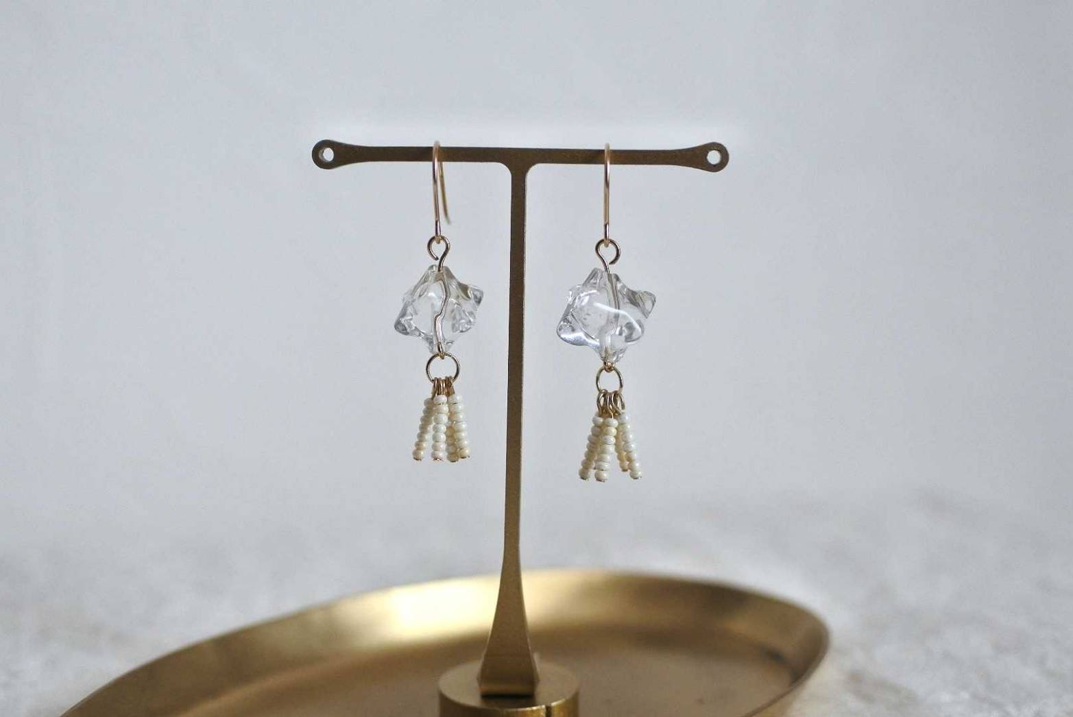 やわらかな光を含んだクォーツに、イタリアのアンティークビーズを添えたピアス。