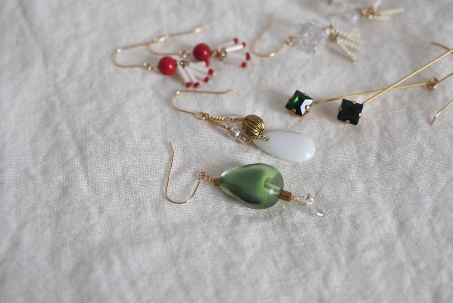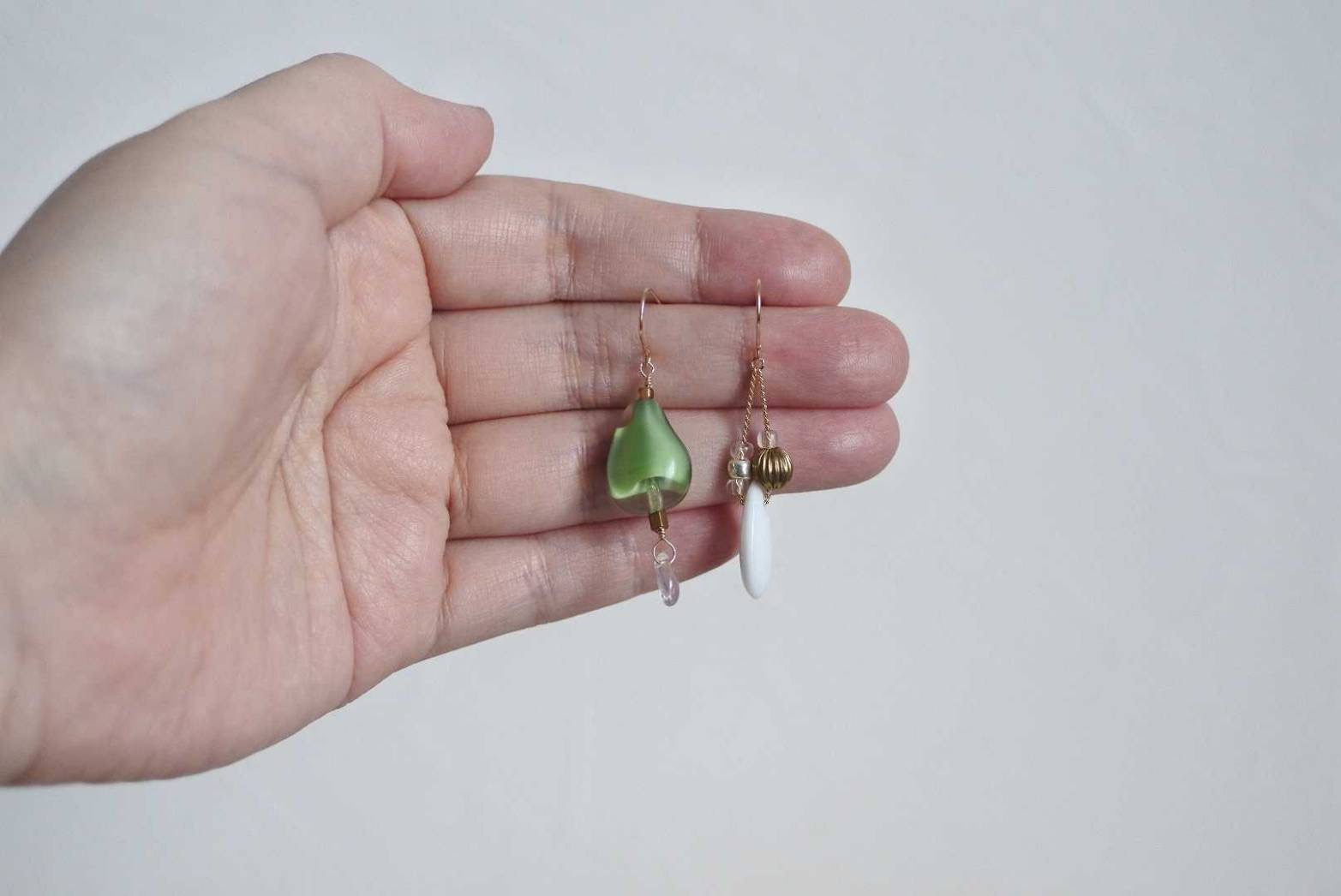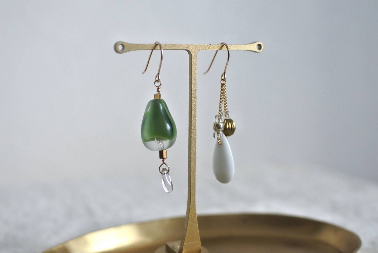「グリーンペアー&ホワイトのアシンメトリーの耳飾り」
