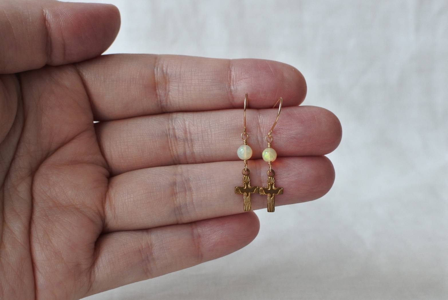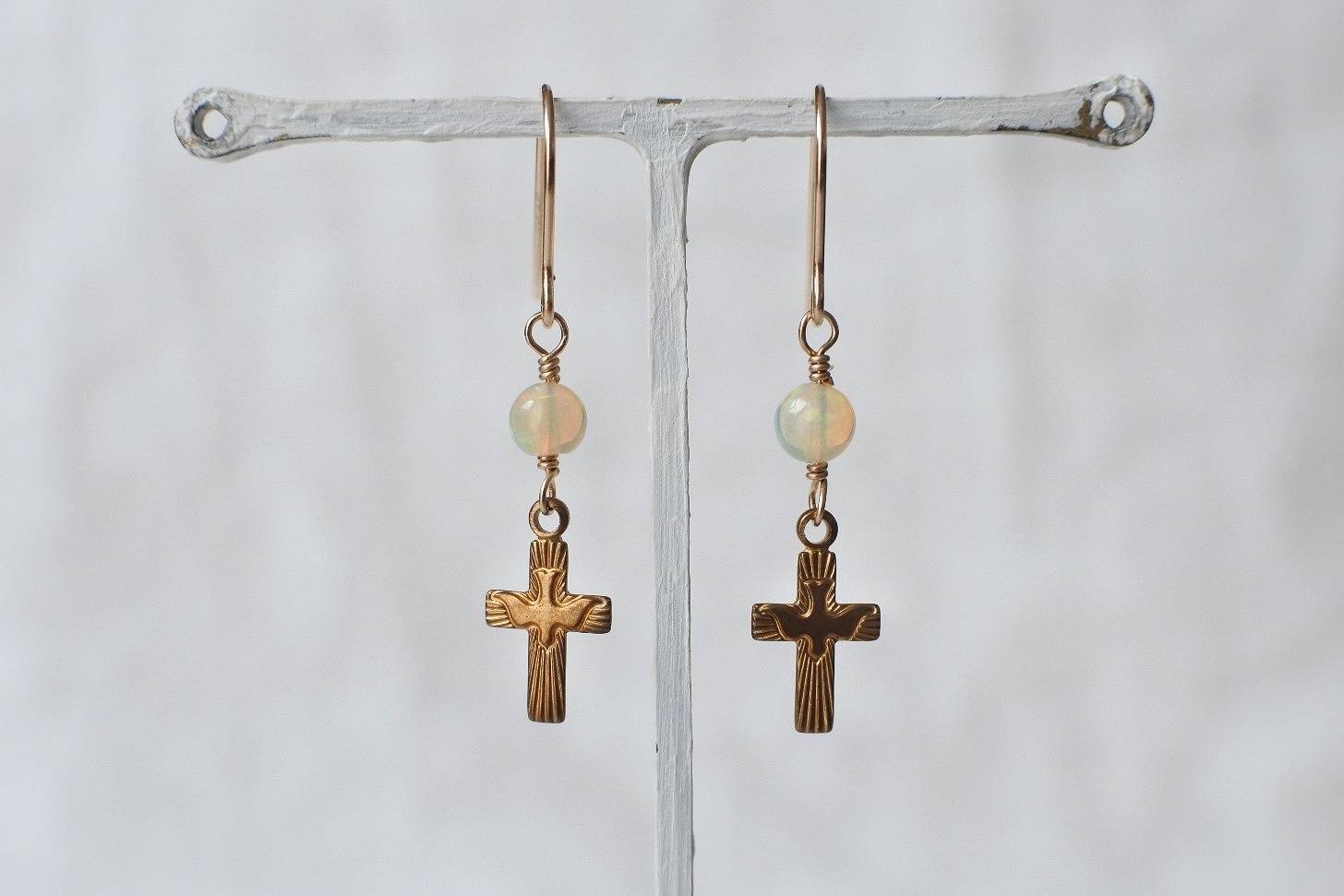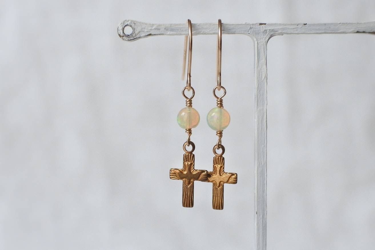 マットな質感がアンティークのような趣を醸し出す真鍮のクロスモチーフ。 そこに、一粒ごとに異なる彩りを見せるオパールを合わせました。